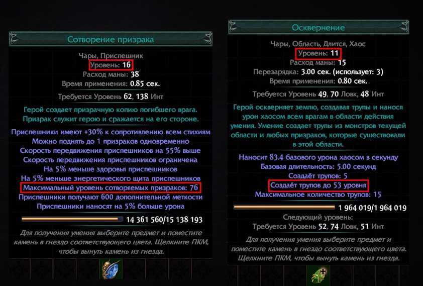 Если вы создаете трупы осквернения, то обратите внимание на максимальный уровень трупов, которое оно позволяет создать. Это указано в описании камня.