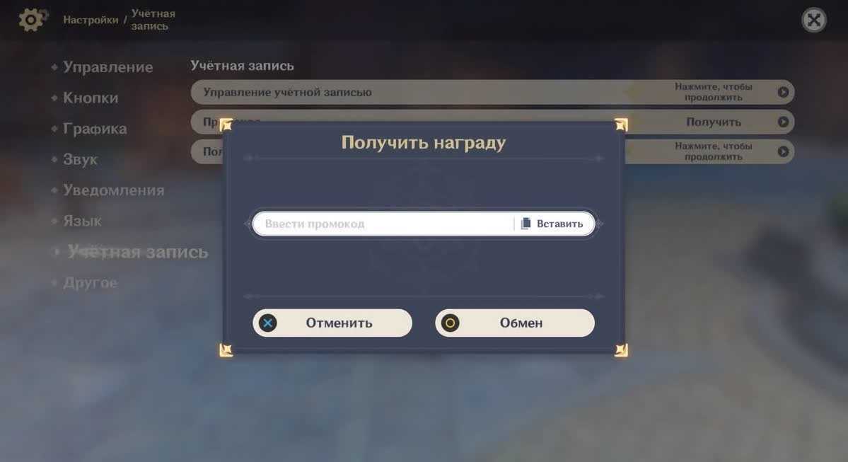 Если вы используете консольную версию Genshin Impact, активация кода происходит через системное меню игры: