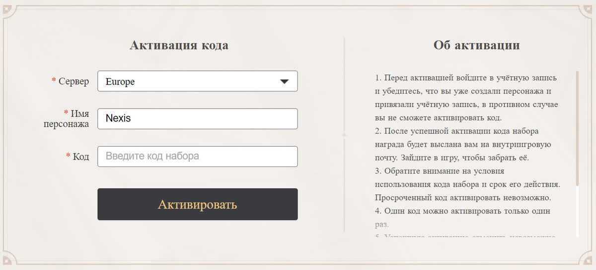 Если же вам удобнее воспользоваться браузером то вам необходимо перейти на сайт Genshin Impact и авторизоваться. В разделе “Промокоды” необходимо указать свой сервер а также указать имя вашего персонажа. После нажатия на кнопку “Активировать” вы увидите результат своих трудов. И не расстраивайтесь если увидите сообщение “Код обмена больше не действителен.” Как мы говорили ранее разработчики регулярно добавляют новые промокоды.