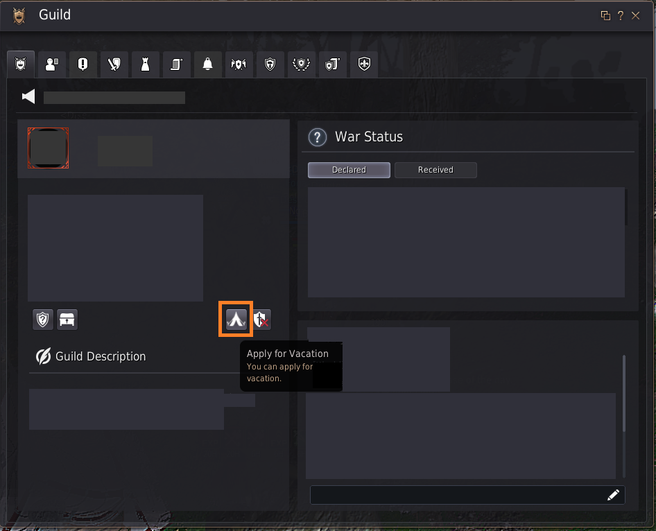 To go on Vacation or return, click the Vacation/Return button in the Guild Information window. At least 4 hours must pass after you click return to participate in a Node war/siege. If a War hero is taking your place, you cannot return until the contract expires as you will not have a spot in the guild.
