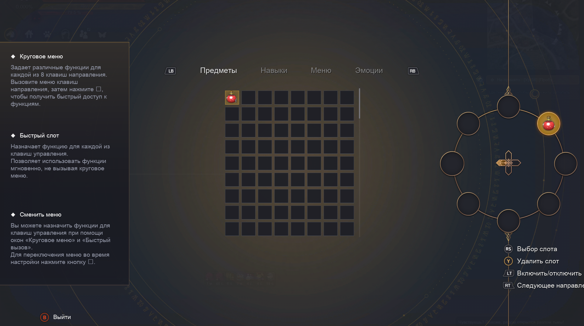 В настройках кругового меню можно изменить круговое меню, настроенное по умолчанию, добавить Зелья HP или другие предметы и навыки в пустые слоты кругового меню, а также настроить использование эмоций.