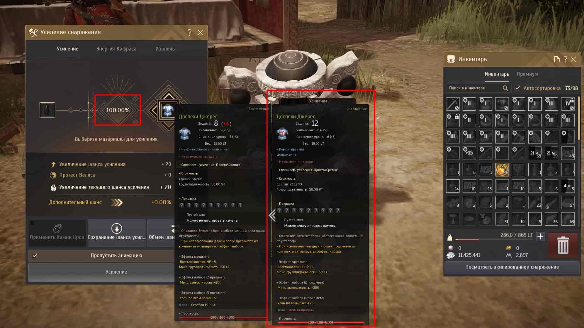Шлем, броня, перчатки и обувь могут быть улучшены с помощью Черных Камней (Броня). “Безопасное” улучшение брони составляет +5. Это означает, что есть 100% шанс на успех, пока вы не достигнете заточки +5. После этого шансы на успех становятся менее вероятными, и если вам не удастся улучшить броню, максимальная прочность предмета будет уменьшаться на 5 каждый раз.