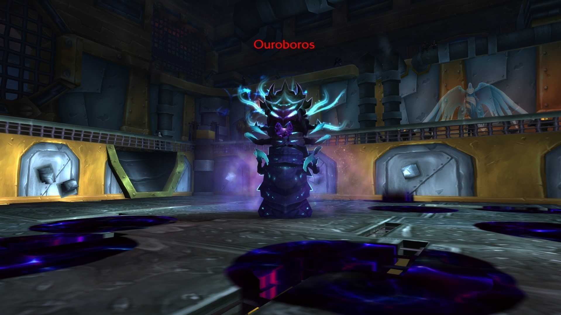 Держитесь подальше от червей, иначе они будут использовать Заклинание #291382). Основная способность — Заклинание #291394). Уроборос будет крутиться по комнате. Определите траекторию движения и не попадайте под нее, попутно следите за лужами на полу.