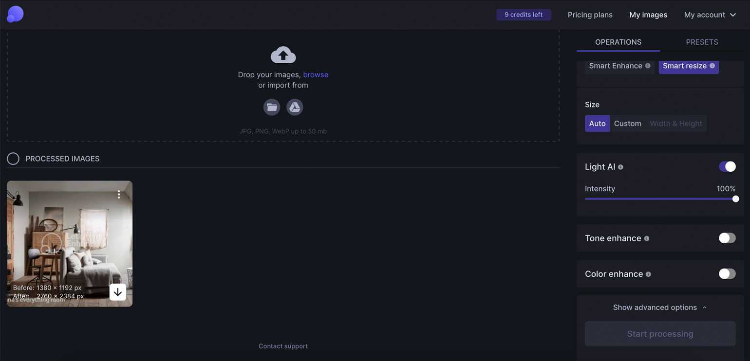 Условия: бесплатно можно обработать и выгрузить восемь изображений, далее нужно переходить на тариф Premium или Advanced.