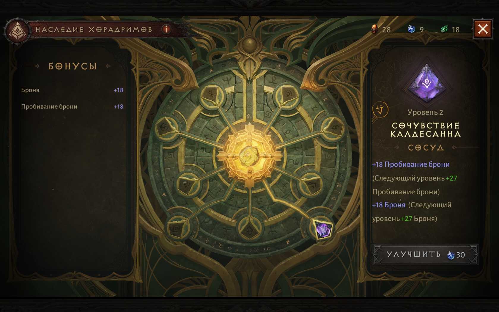 Вернитесь в главное помещение Святилища, откройте интерфейс Наследия и улучшите Сочувствие Калдесанна до 2 уровня