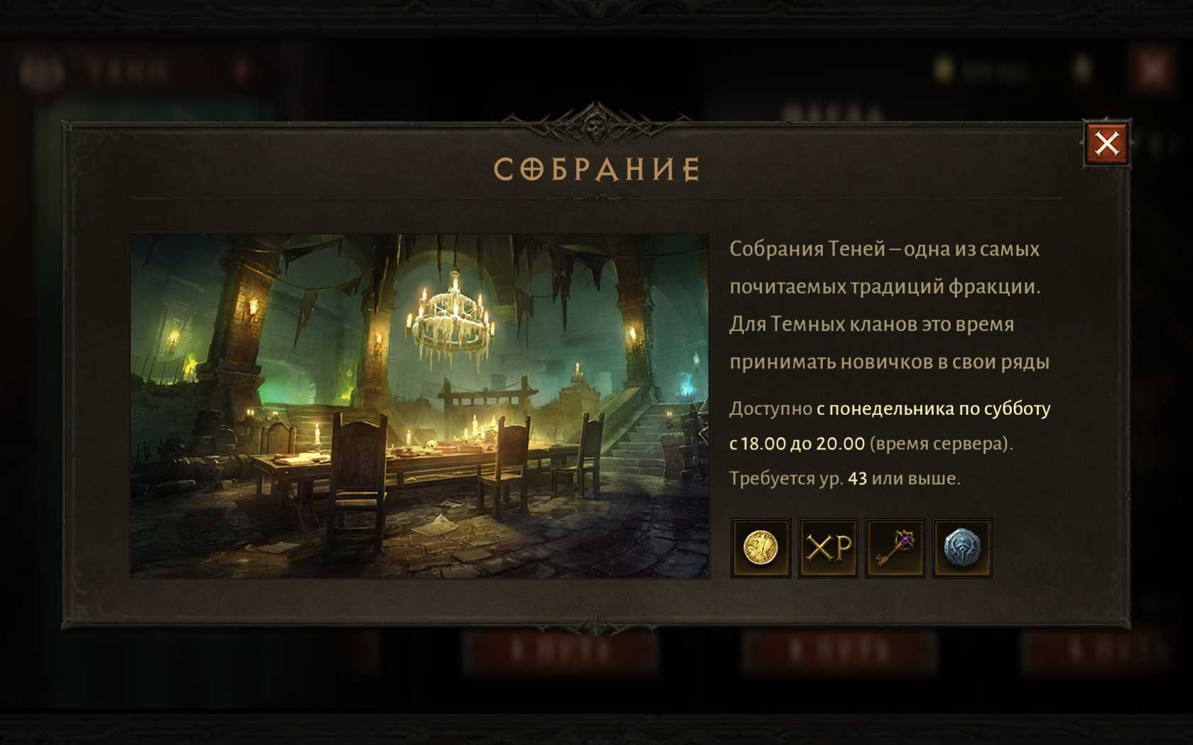 Собрание Теней – фракционное мероприятие, которое проводится каждую субботу с 14:00 до 22:00 в Шепчущем дворе. Пока длится Собрание, все члены фракции могут создавать Темные кланы и присоединяться к ним. Кроме того, в это время вы можете передать кому-то Благословение Акебы или получить его от другого игрока. Этот эффект дается рандомным участникам собрания каждые 2 минуты и позволяет получить награды в виде сундучка с сокровищами и Знаками. Всего за 1 собрание можно получить 4 разных Благословения Акебы. Убедитесь, что вы собрали все награды, прежде чем уйти с мероприятия.