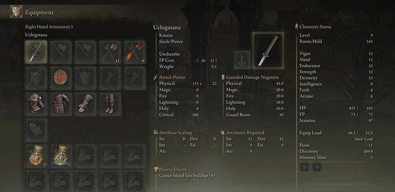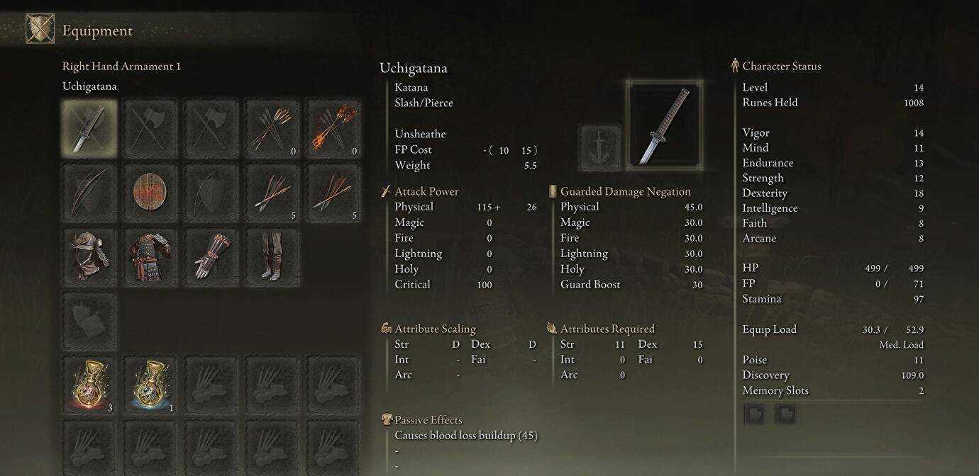 Например, катана в Elden Ring, такая как Uchigatana, в основном фокусируется на Сила и ловкость со статистикой, показывающей силу атаки 115+18 (базовая форма).