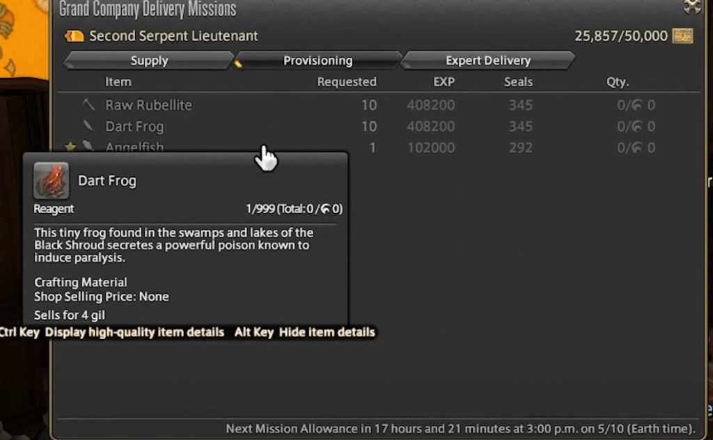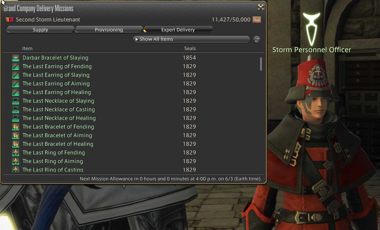 That’s why you have to work with the previously mentioned methods until you get to this one. During an Expert Delivery, you bring valuable items to the Grand Company and sell them to an in-house vendor in exchange for seals. Acceptable items are those whose names are colored in pink, blue or green. Yellow gear is not accepted. You can repeatedly deliver items you have earned from dungeons and trials. The exception is weapons and armor that have been obtained from job missions.