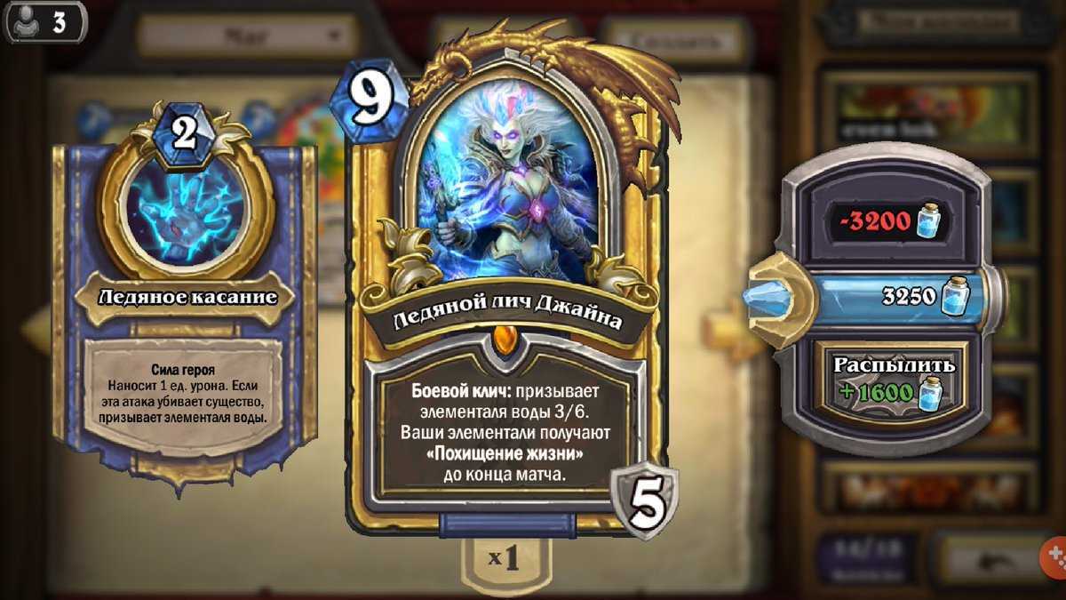 - Disenchanting Cards : Hearthstone позволяет вам «распылять» карты в тайную пыль, которую вы можете использовать для создания любой другой карты. Вы можете распылять карты, у которых есть дополнительные карты, — вы можете разыграть только две одинаковые карты в колоде, поэтому, если вы достанете третью из колоды, вы можете разыграть ее. Вы также можете разочаровать карты, которые вы не планируете использовать. Уловка здесь в том, что карты обычно разочаровываются лишь в небольшой части их стоимости. Например, распыление обычной карты даст вам 5 единиц пыли, а создание общей карты обойдется вам в 40 единиц пыли. Таким образом, вам придется разочаровать восемь обыкновенных, чтобы создать еще один общий.