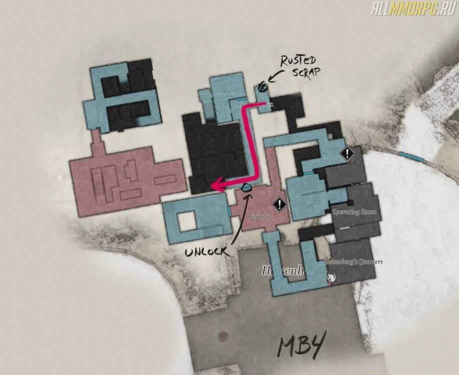 Откройте решетку и пройдите через нее. Поверните налево, чтобы отпереть вторую дверь, ведущую в литейную. После идите по коридору на запад и спускайтесь по лестнице.