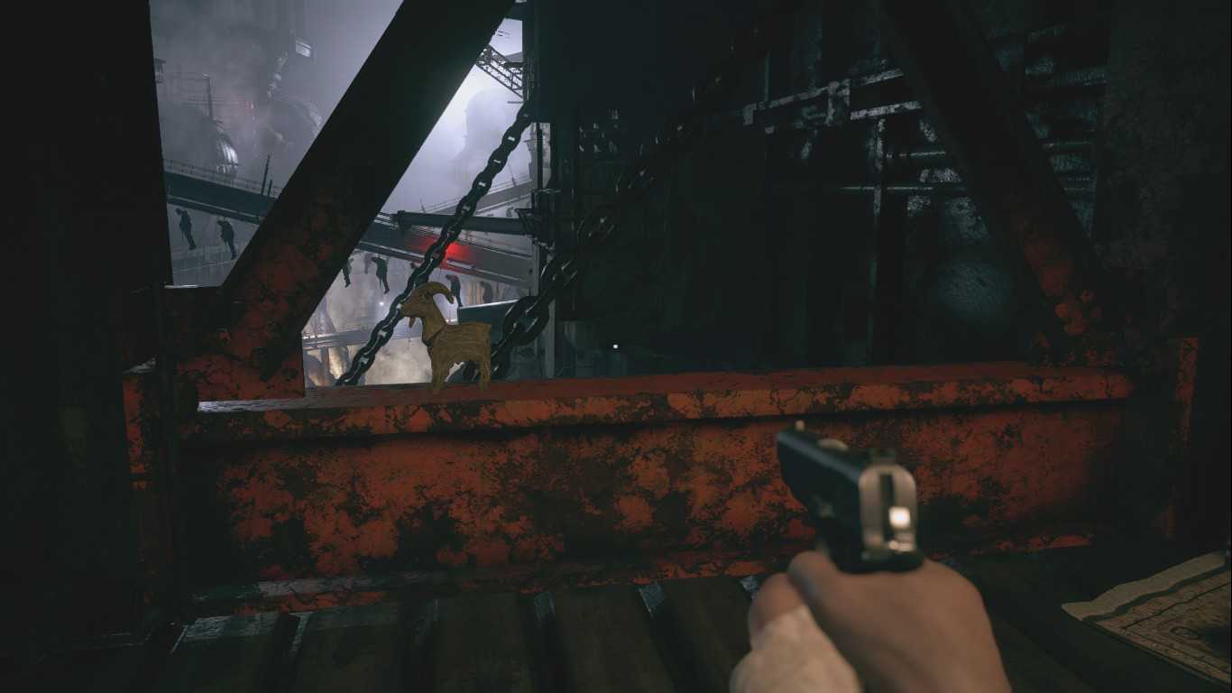 Дойдя до конца прохода, вы будете затянуты воздухом в вентиляционный канал. Чтобы остановить лопасти огромного вентилятора, стреляйте в его центр по оранжевому индикатору. После того, как опасность миновала, вернитесь назад и на краю уничтожьте козий оберег.