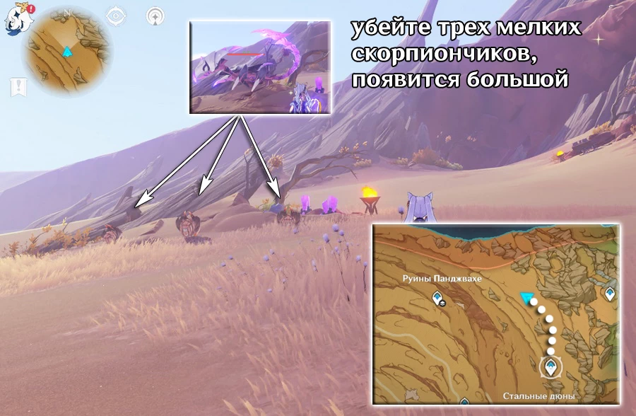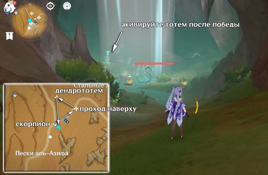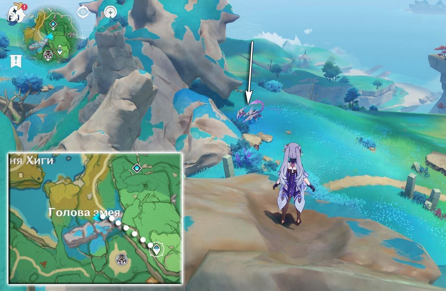 Прыгайте в Инадзуму на остров Ясиори. Слева от головы змея гуляет симпатичный скорпиончик.