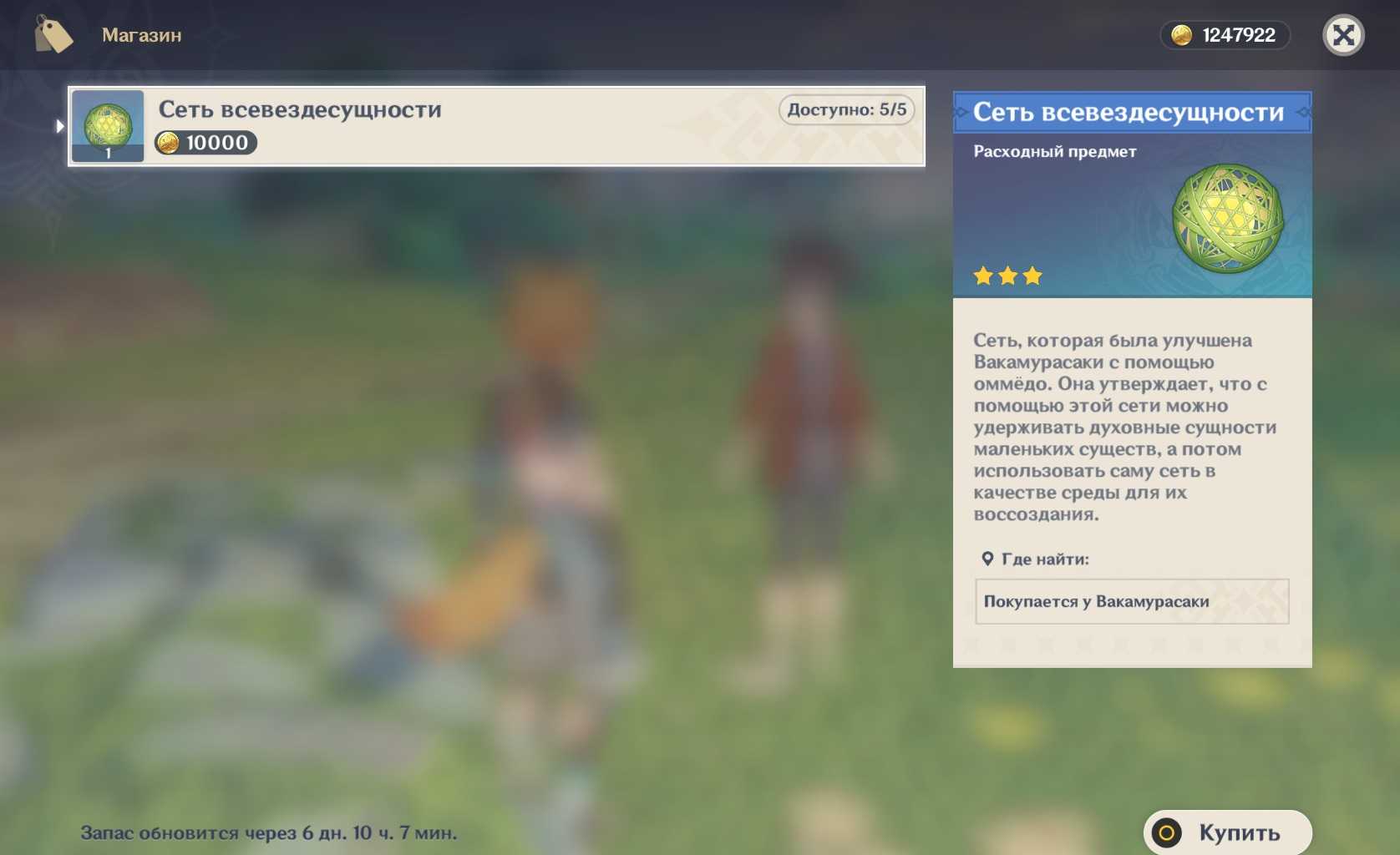 Новые инструменты можно купить у Вакамурасаки, которая находится возле телепорта на юге Равнины Бякко (возле столицы Инадзумы). 1 Сеть всевездесущности стоит 10 тысяч моры. В неделю игрок может купить только 5 инструментов.