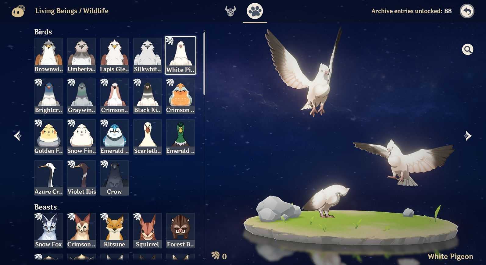 Проверьте архив, чтобы узнать, какие животные могут быть пойманы (изображение с Genshin Impact)