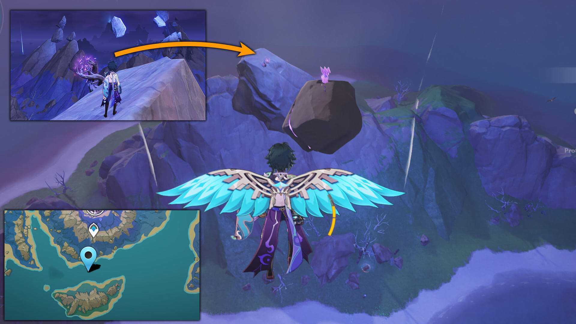 22. На вершине горы рядом с Фазовыми вратами есть парящий камень. Ставим рядом любой Гео объект и забираемся на камень.