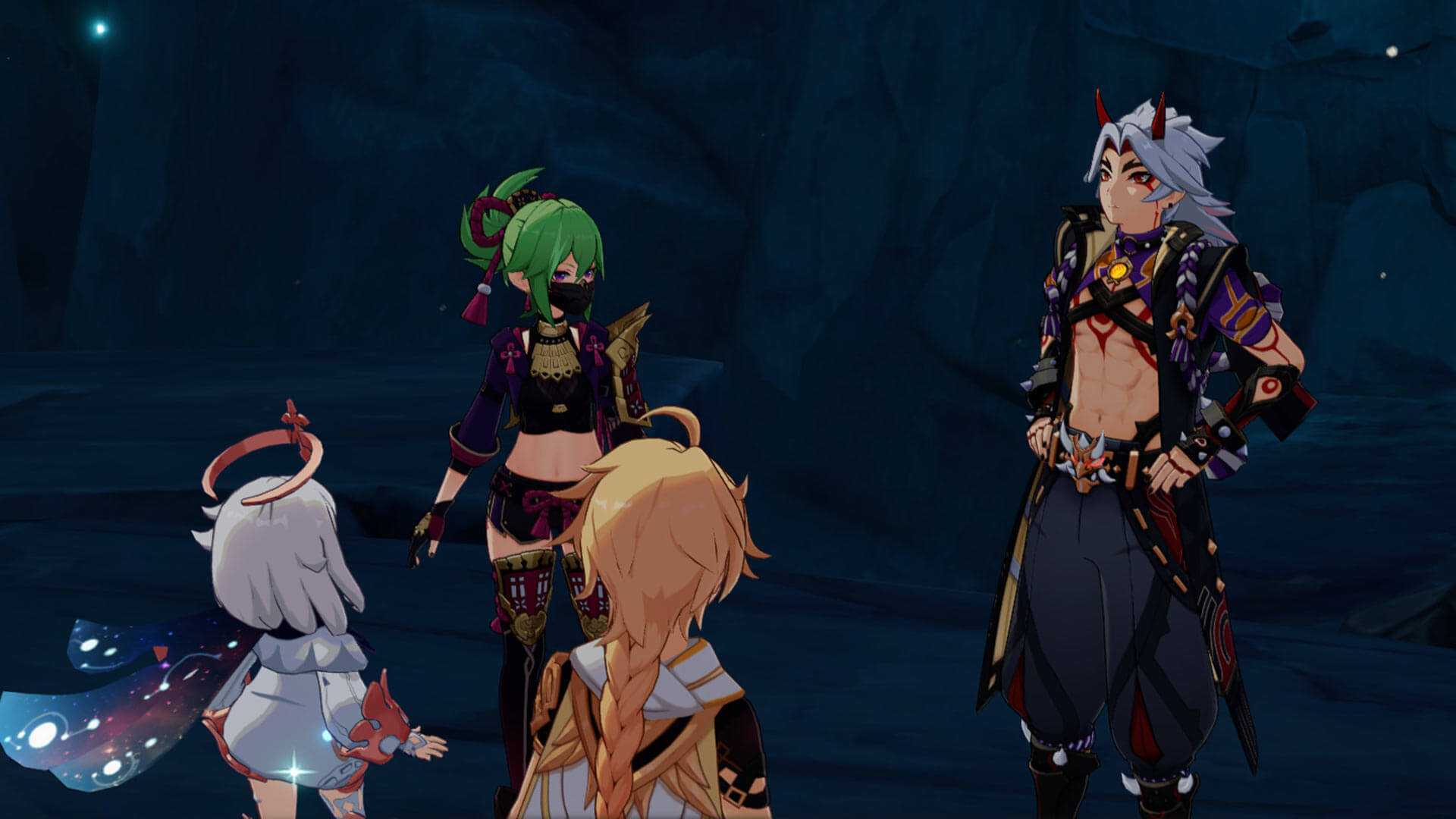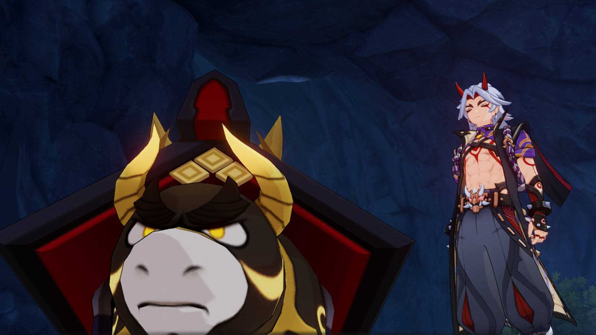 Неожиданные встречи только начались. Приходит никто иной, как великий и могучий Аратаки Итто со своей сообщницей по имени Куки Синоби, и которая, судя по всему, является «головой» (та, что думает) в их компании, или, как сказала Паймон, «бесполезный босс» и «умелая помощница». Кстати, советую не пропускать диалоги диалоги между Паймон и Итто.
