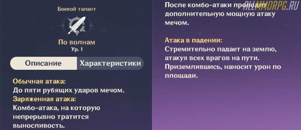 «По волнам» – базовый навык Бэй Доу. С его помощью персонаж наносит до 5 последовательных атак мечом. При долгом нажатии клавиши навыка герой совершает комбо-атаку, которая тратит определенный запас выносливости.