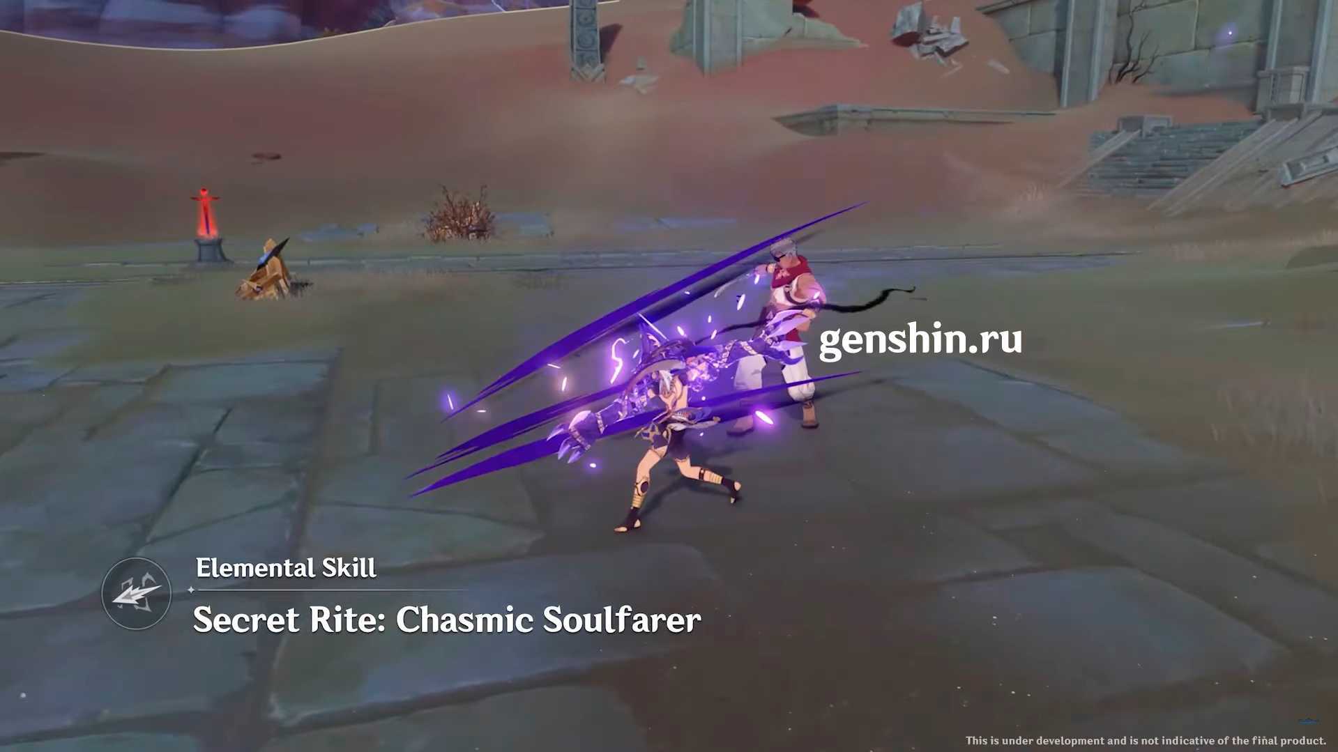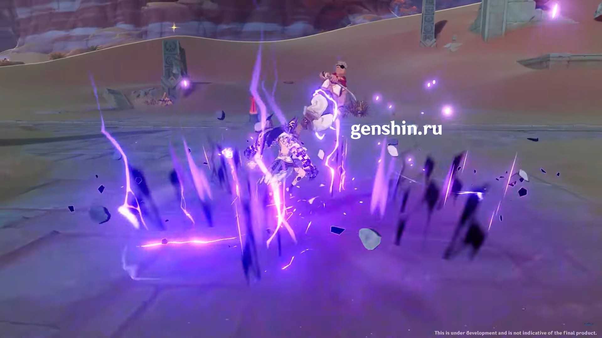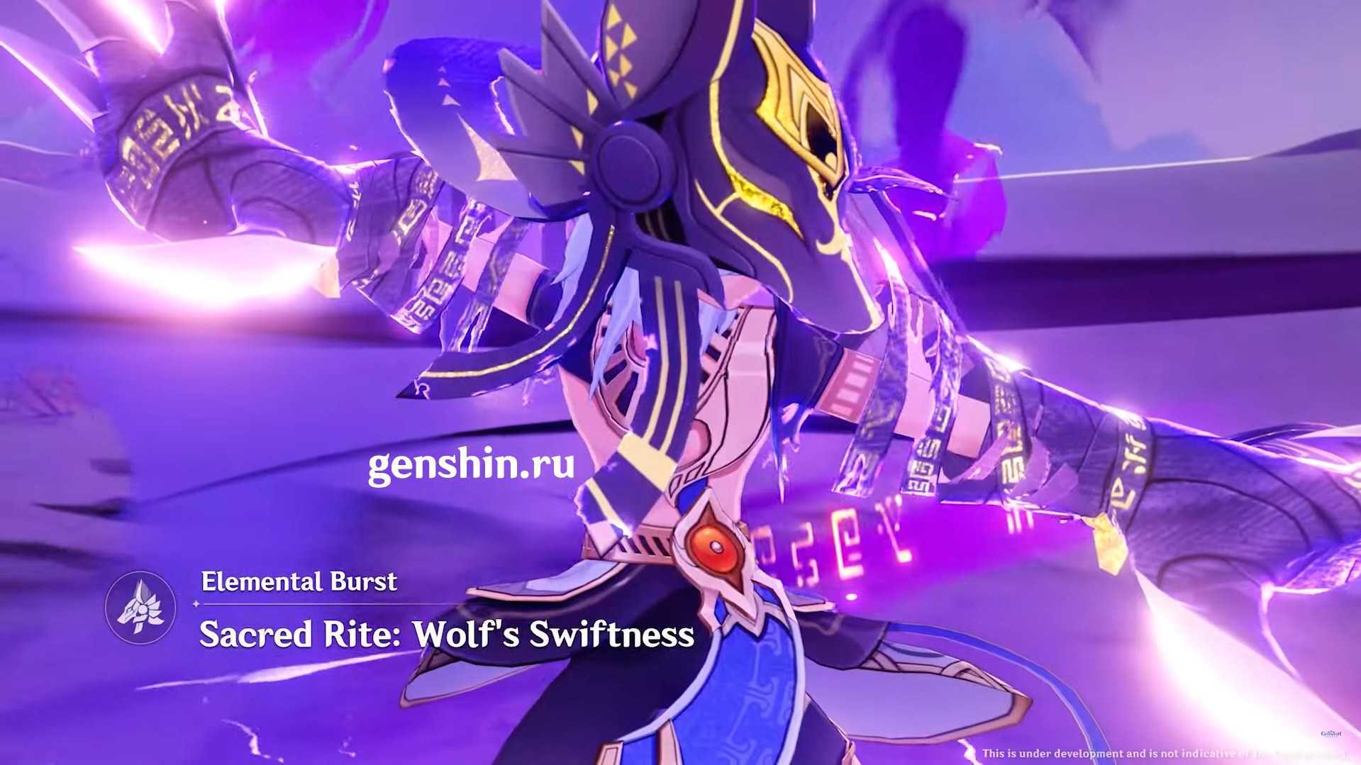 При активации взрыва стихии Священный обряд: Волчье проворство Сайно входит в состояние Поклявшегося прокладывать путь и конвертирует все обычные,заряженные и атаки в падении с Истинного урона в Электро. Ульта длится 10 секунд, но эффект позволяет продлить ее 18. Откатывается 20 секунд.