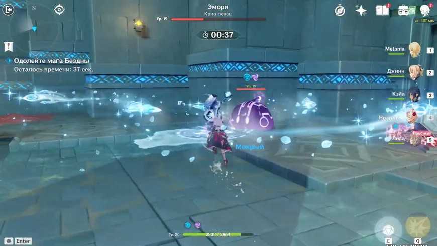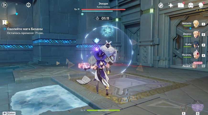 Победить Крио певца Эмори непросто, но вполне реально. Постарайтесь как можно скорее разбить его Крио щит. Лучше всего для этого использовать стихию Пиро , также применяйте подходящие элементальные реакции, например, “Перегрузка” (+), которую может создавать все та же Лиза.