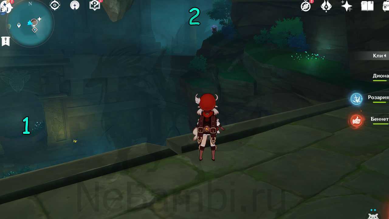 Как только взобрались на скалу – включите снова чувство стихий . След опять-таки окажется слева от Персонажа рядом с мини-лагерем хиличурлов.