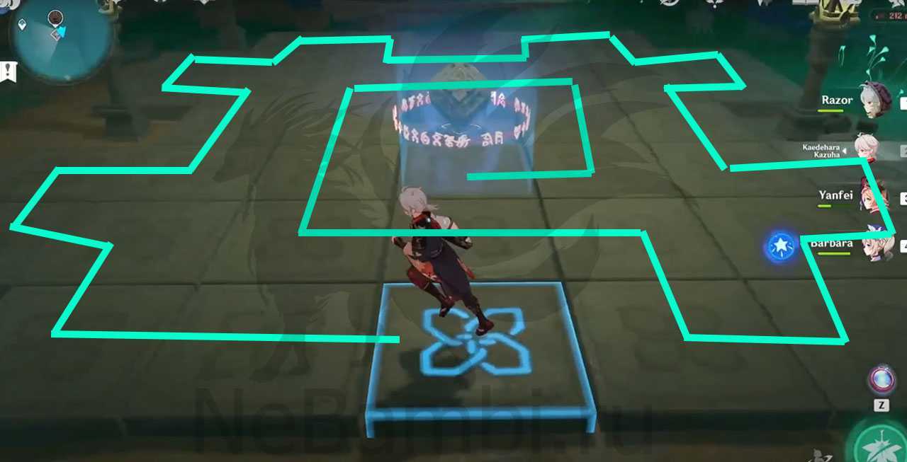 Вам нужно пройти по плитам до голубого барьера так, чтобы они все были активированы. Но нельзя несколько раз наступать на одну и ту же плиту и если хоть одна плита будет не активирована, то загадка сбросится и нужно будет начинать сначала.