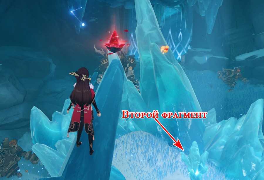 После победы над монстрами лед в центре исчезнет, и вы сможете спуститься в пещеру. Именно в нем обнаружен второй лишний кусок льда.