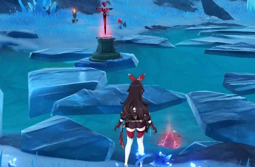 Рядом с тестовым знаком летает фея. Соберите в воде 1 багровый агат. Просто постойте на льду пару секунд, и он растает.