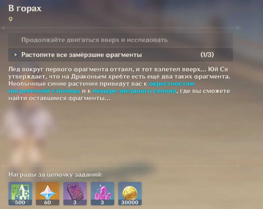 Итак, в первом задании вы растворили фрагмент, теперь вам нужно найти еще два фрагмента странного льда. Исследования показывают местонахождение льда: Окрестности Похороненной столицы и Пещеры Звездного света.