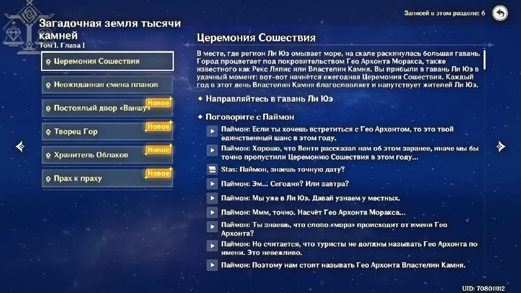 | Церемония СошествияВ месте, где регион Ли Юэ омывает море, на скале раскинулась большая гавань. Город процветает под покровительством Гео Архонта Моракса, также известного как Рекс Ляпис или Властелин Камня. Вы прибыли в гавань Ли Юэ в удачный момент: вот-вот начнётся ежегодная Церемония Сошествия. Каждый год в этот день Властелин Камня благословляет и напутствует жителей Ли Юэ. | •Направляйтесь в гавань Ли Юэ•Поговорите с Паймон•Поговорите с местными жителями•Поговорите с местными жителями•Поговорите с местными жителями•Отправляйтесь на террасу Юйцзин•Загадайте желание на террасе Юйцзин•Загадайте желание на террасе Юйцзин•Присоединитесь к толпе и дождитесь начала церемонии•Наблюдайте за церемонией•Поговорите с Паймон•Ускользните от Миллелитов•Поговорите с незнакомым мужчиной•Поговорите с Чайльдом в Банке северного королевства |