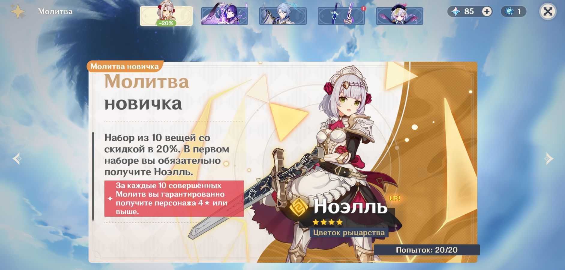 - Молитва новичка – предназначена для тех, кто только начал играть в Genshin Impact. Есть небольшая скидка на переплетающиеся судьбы (синие сферы), а при первом использовании 10 молитв вы получите персонажа Ноэль (средний уровень). Использование еще 10 молитв гарантирует выпадение 4-звездочного персонажа или предмета.