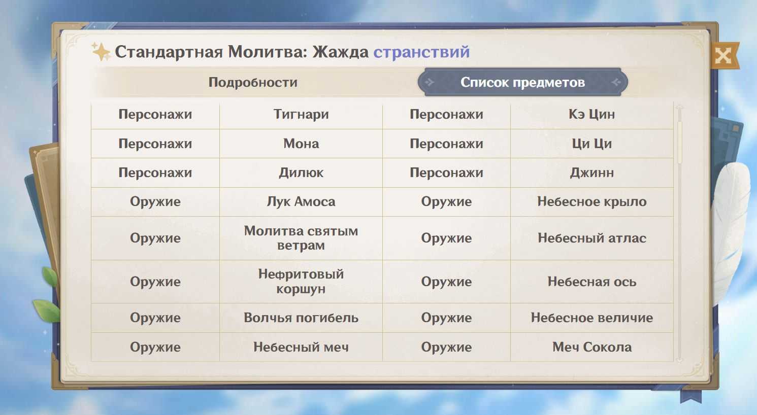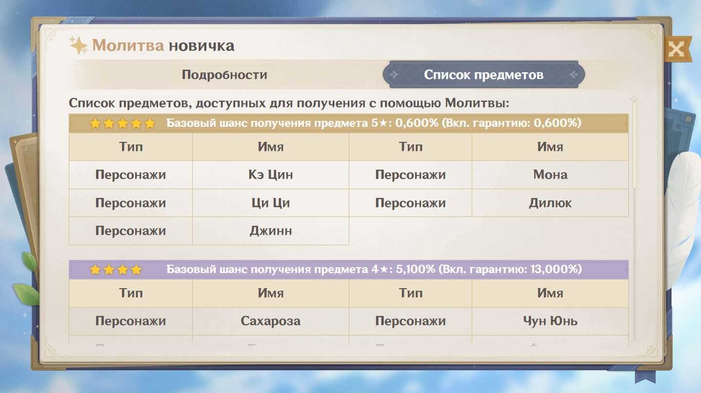Предлагаем заранее проверять детали каждого типа молитвы, чтобы знать вероятность выпадения, а также лут. Отличный пример — «Баллада кубков», дающая высокий шанс заполучить таких персонажей, как Венти, Фишль, Сян Лин и Барбару.