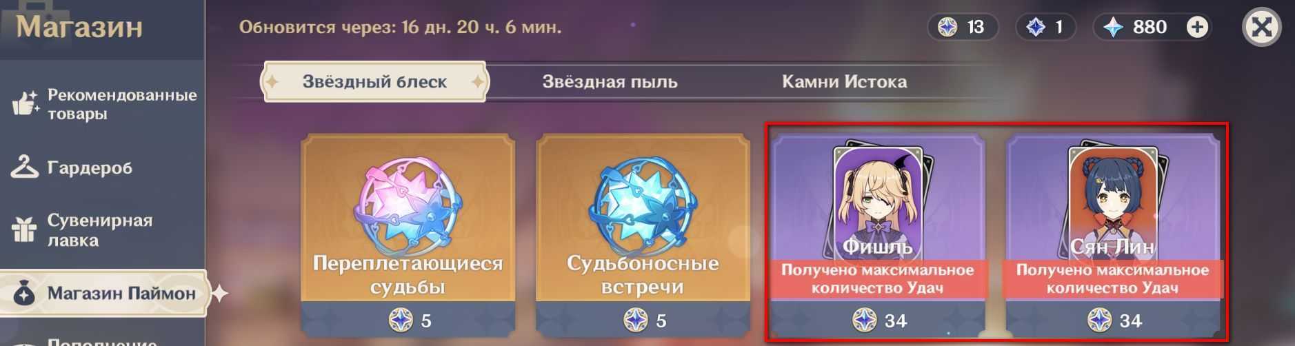 Каждый раз, когда вы совершаете молитву, у вас есть шанс получить особую валюту — «Блуждающий звездный блеск». Его можно тратить на «Переплетающиеся судьбы» и «Судьбоносные встречи» или копить. Накопив 34 единицы, вы сможете купить персонажа в Магазине Паймон. Вот как это выглядит.