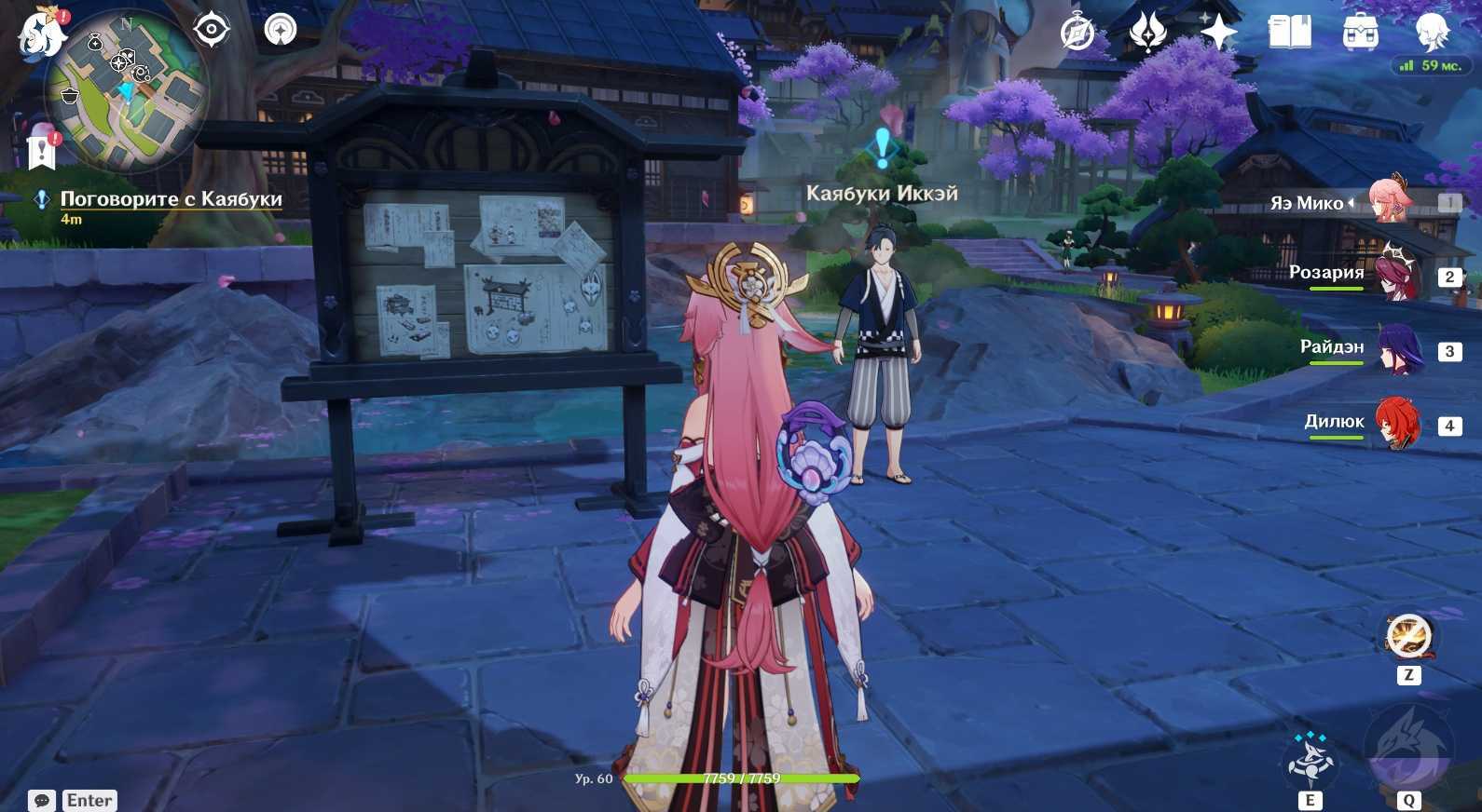 Время можно перемотать при помощи меню Паймон. Место встречи — ресторан «Призрачная беседка». Возле него вы встретите читателей, которые уже обсуждают чёрное облако над горой Ёго. Саму Яэ Мико вы найдете внутри.