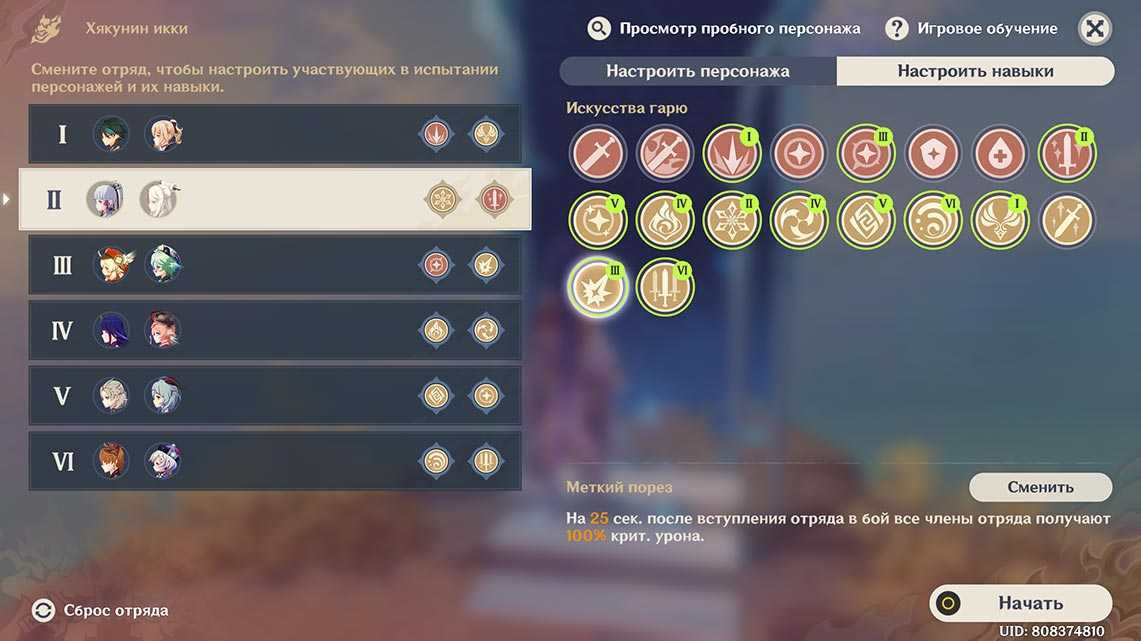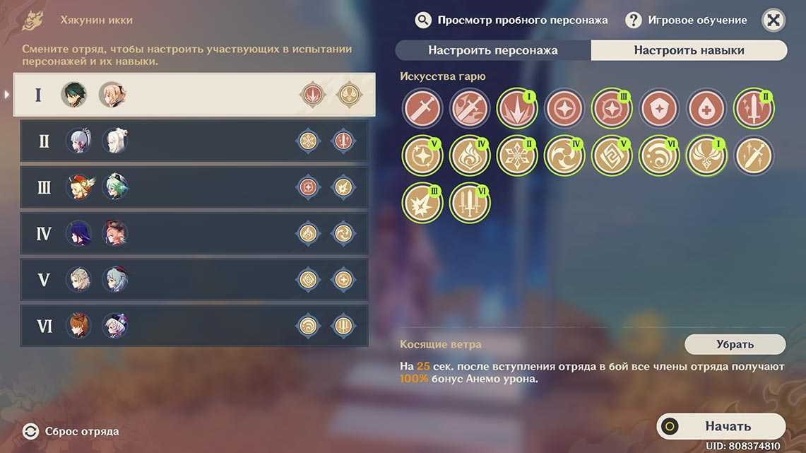 Вы можете выбрать любых других героев, либо переставлять их местами в зависимости от испытания. Например, на первом этапе («Самое время для хайку!») можно ставить в группы персонажей с одинаковыми стихиями, активируя элементальный резонанс.