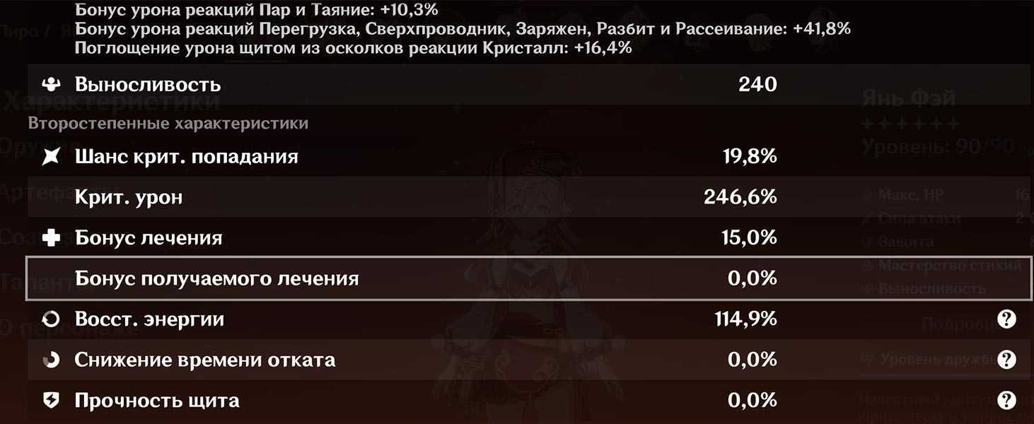 Отдельные характеристики можно завысить больше, чем другие. Например, Янь Фэй может наносить больше урона с высоким шансом крита из-за срабатывающей пассивки, наносящей бонусный пиро урон по площади. Однако, если замаксить критический урон, а шанс крита увеличить с помощью еды, можно увеличить дамаг от обычных и заряженных атак в 2-3 раза.