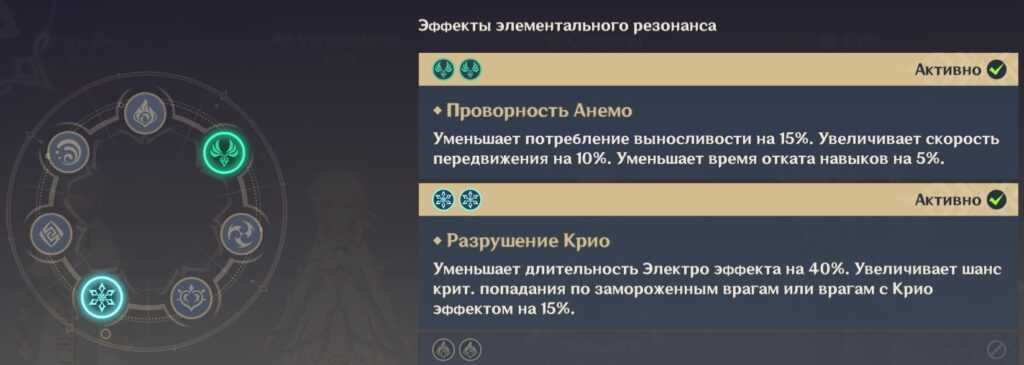 Два персонажа геншин одной стихии в отряде способны создавать элементальный резонанс, дающий всем членам отряда определенные преимущества. При необходимости и наличии двух пар персонажей одной стихии вы можете получить бонус сразу от двух элементальных резонансов, например, собрав отряд, где у вас будет по два героя стихий Пиро и Крио.