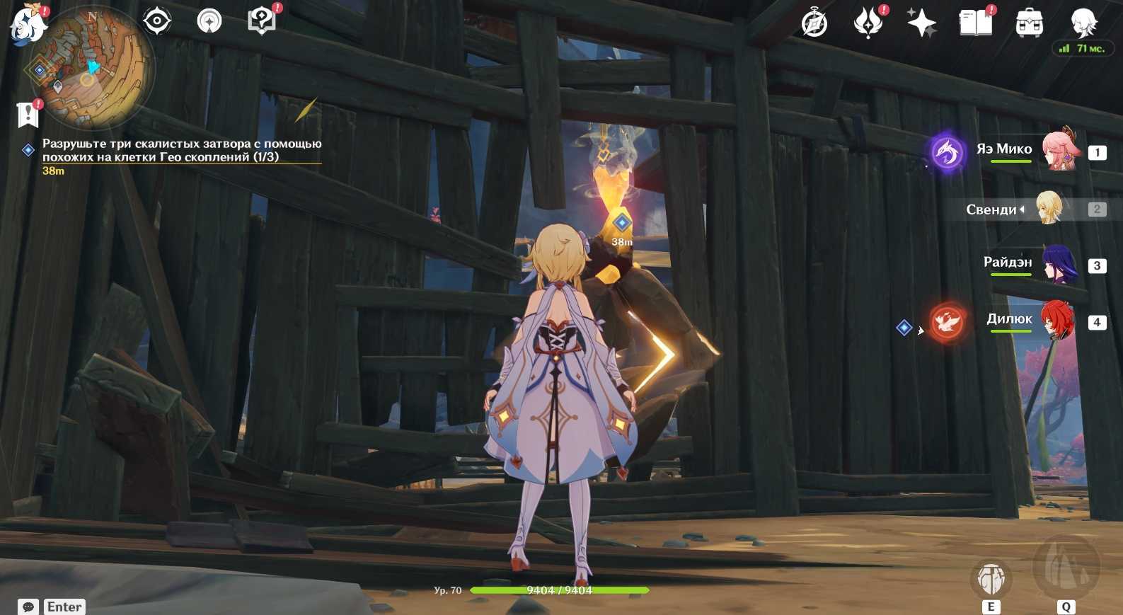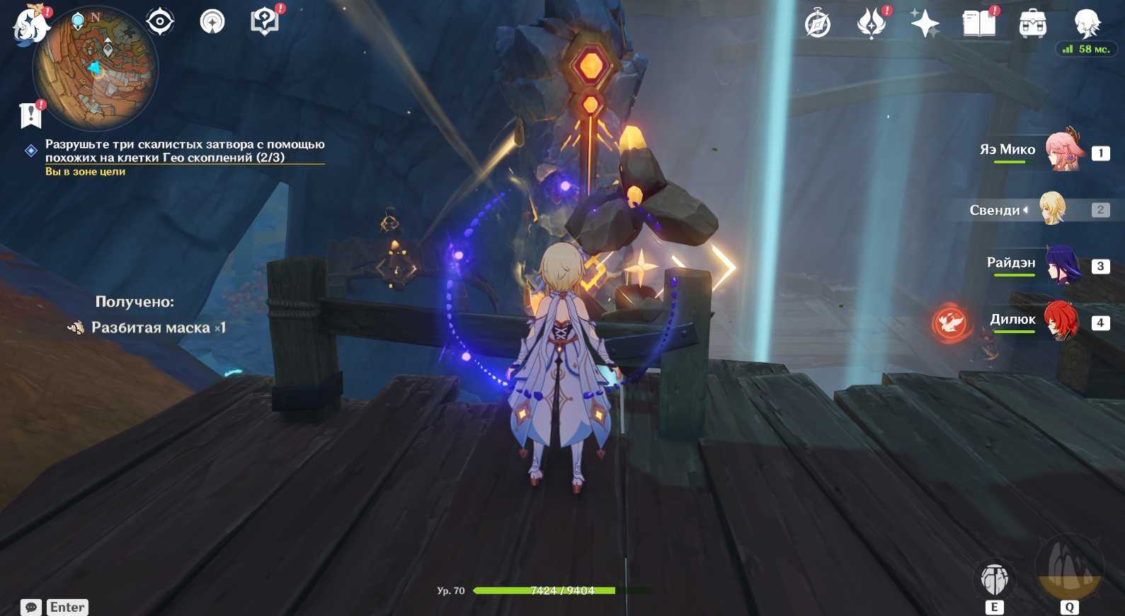 - Следующий шаг – разрушить скалистый затвор. Чтобы сделать это, вам необходимо осмотреться вокруг и отыскать странные Гео скопления. После надо подобрать особую Гео руду и получить бафф, который позволит активировать Гео скопления и использовать их для разрушения скалистого затвора. Подобнее об этом мы рассказали ниже: