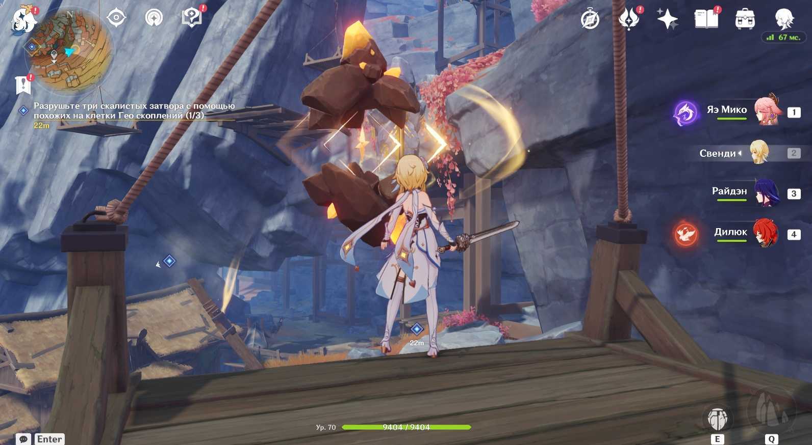 | Ударьте любой атакой по Гео скоплению, чтобы его частицы попали в скалистый затвор. Повторите то же самое со вторым Гео скоплением на противоположной стороне | ![]() |