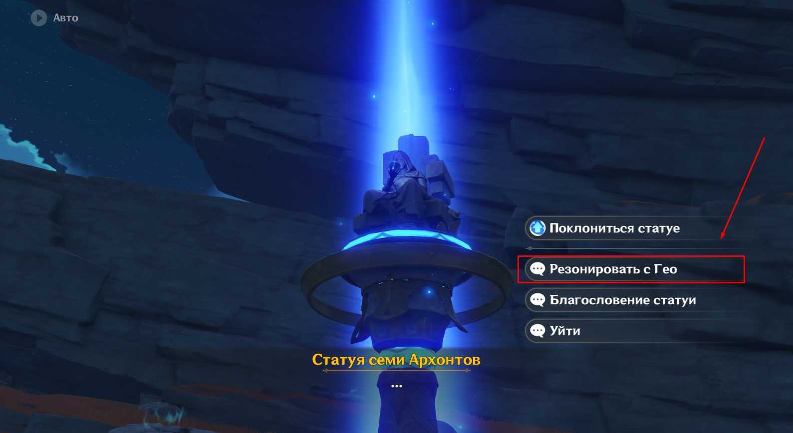 | Переключитесь на любого героя стихии Гео. Если вы еще не получили платного персонажа этого элемента, выберите Путешественника, телепортируйтесь к статуе Семи Архонтов в Ли Юэ, взаимодействуйте с ней и выберите диалоговую строчку «Резонировать с Гео». Так вы смените стихию главного героя на Гео | ![]() |