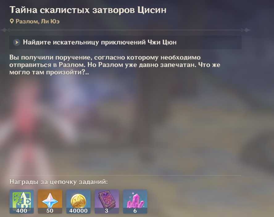 Итак, в нашем журнале заданий появляется квест «Тайна скалистых затворов Цисин». Он является частью серии заданий «Записи о путешествии вглубь Разлома». Приступаем к его прохождению: