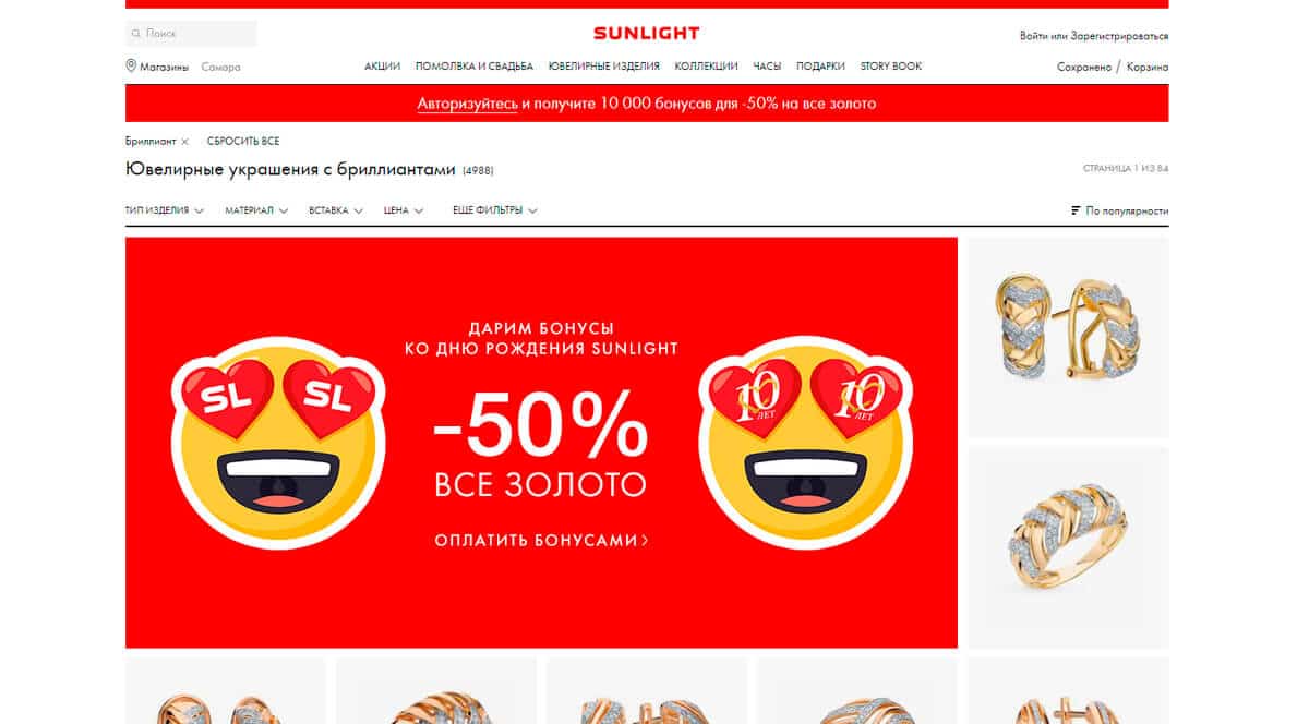 Помимо того, что Sunlight является одним из крупнейших в стране розничных продавцов ювелирных изделий, они предлагают привлекательные наручные часы, которые помогут завершить ваш стиль. Золотое колье с бриллиантами будет центральным элементом любого образа. Недорогие помолвочные и обручальные кольца оснащены камнями разной огранки и размеров.