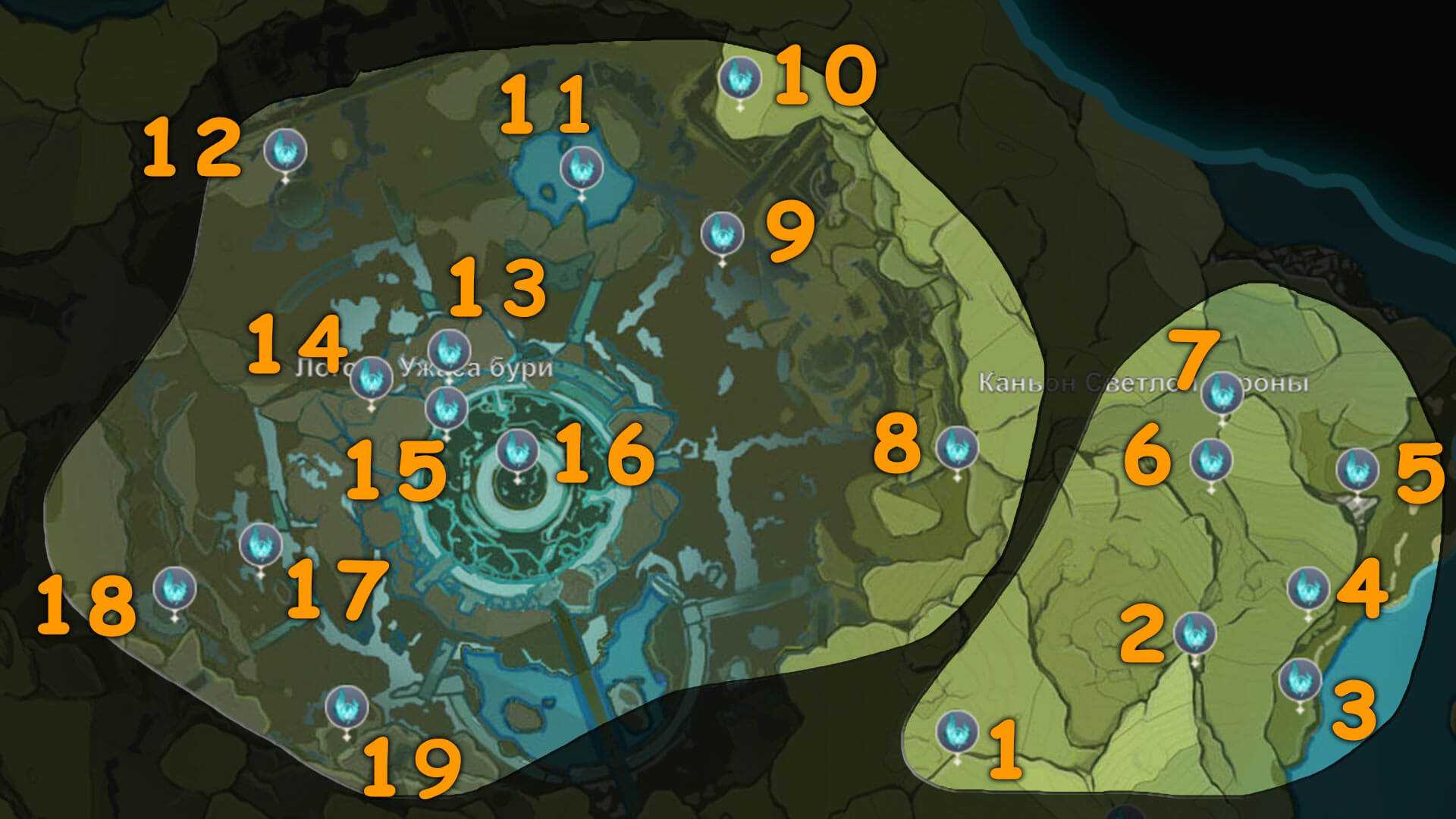 11 — Анемокул находится в центре небольшого озера. Парим до него с ближайшего камня.12 — На вершине строения, добраться туда можно по колонне, главное карабкаться не прыжками (то есть не зажимать пробел), чтобы хватило выносливости.13 — Внизу под скалой, в небольшой пещере.14 — За лагерем хиличурлов в небольшой пещере.15 — Перемещаемся к статуи Архонтов и спускаемся на второй ярус руин. Рядом с анемокулом сидит Страж руин.16 — Перемещаемся в само логово Ужаса Бури (где вход в подземелье) и залетаем на самый верх башни.17 — Находится высоко в воздухе. Рядом на горе есть Анемо столбик, активируем его и через ветряные потоки летим до анемокула.