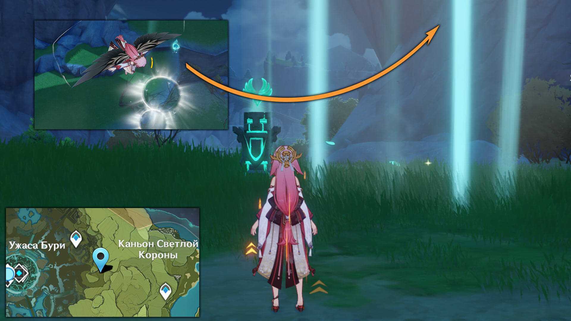 8 — Бежим в самый низ под гору. Активируем Анемо столбик и летим с помощью ветряных потоков до Анемокула.