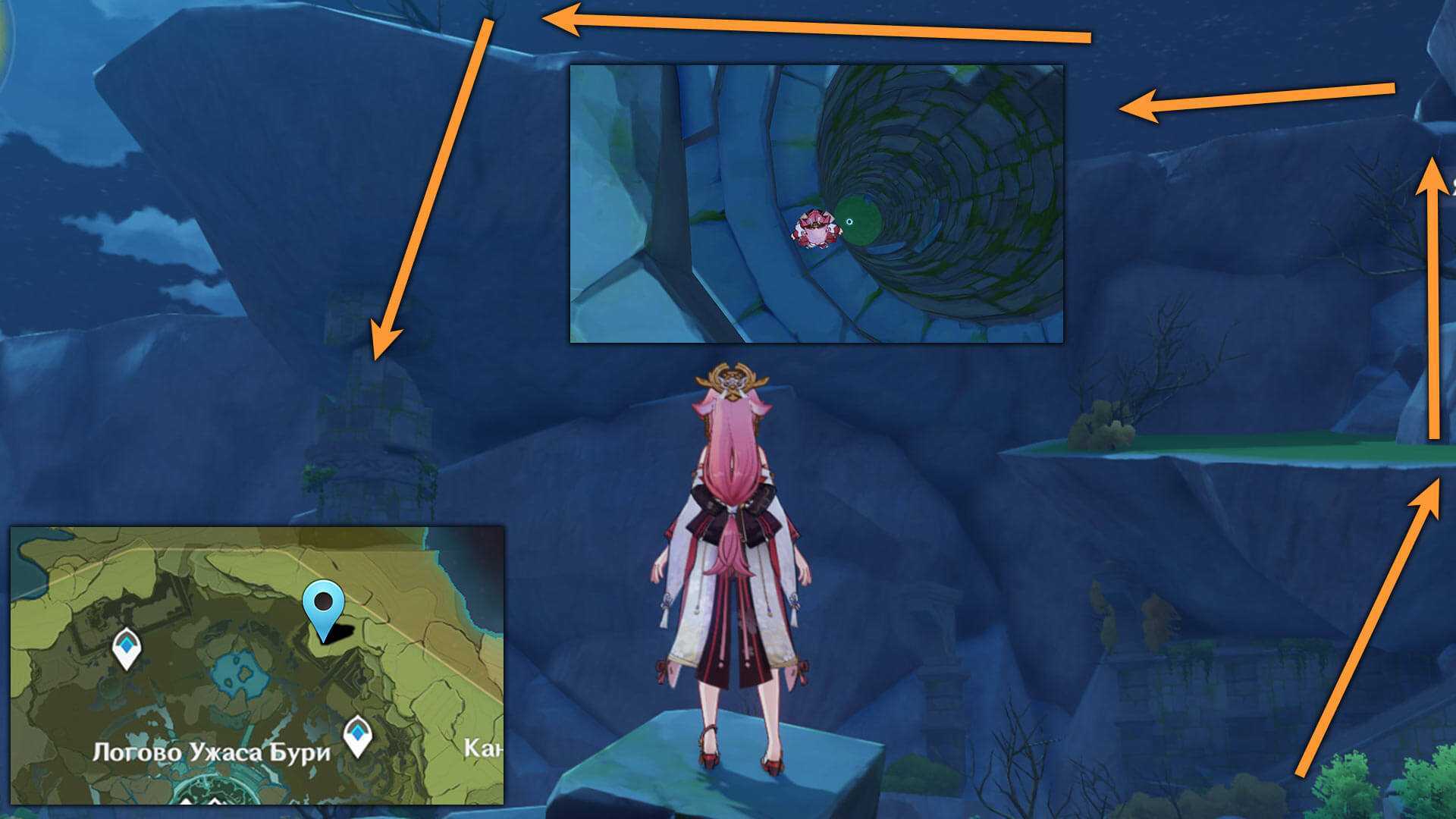 Вы можете найти туннель, ведущий к пляжу, недалеко от Скрытого дворца формулы Ляньшань. В туннеле есть уступ, по которому можно подняться с Геокулусом наверху.