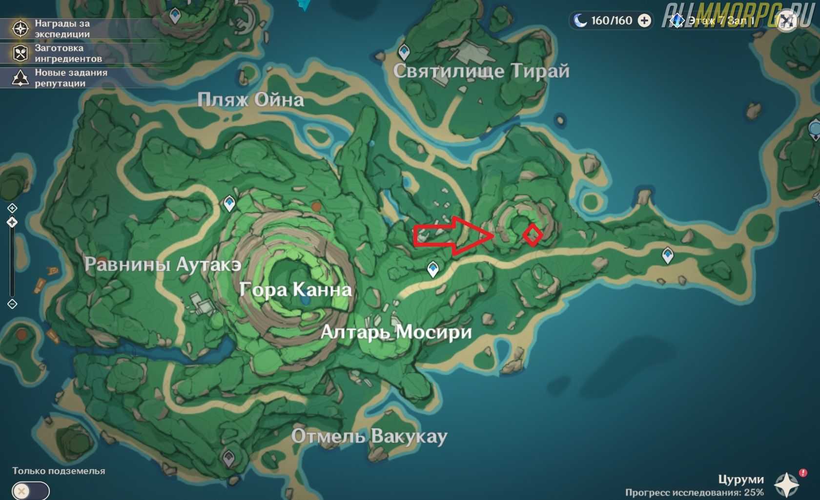 Прежде чем взяться за поиски соответствующих предметов, вам необходимо будет добыть инструмент под названием Странное перо, пройдя задание мира «Октава Маусиро». Сделав это, направляйтесь на пик Сирикоро, показанный на карте ниже, и спрыгните в дыру вниз. Пройдите в пещеру и спуститесь вглубь нее, как вы уже делали это прежде.