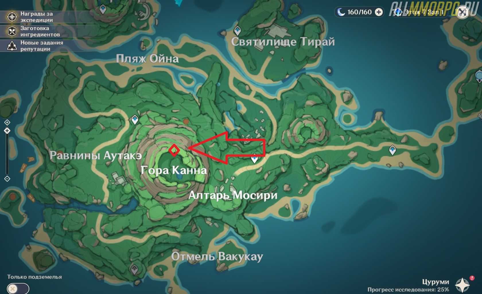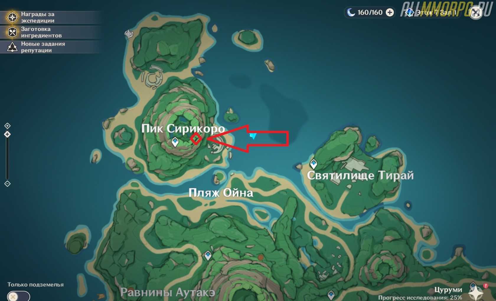 Нужно подняться на вершину, воспользовавшись у подножия Ветвью громовой сакуры или телепортироваться туда, если ранее уже активировали путевую точку.