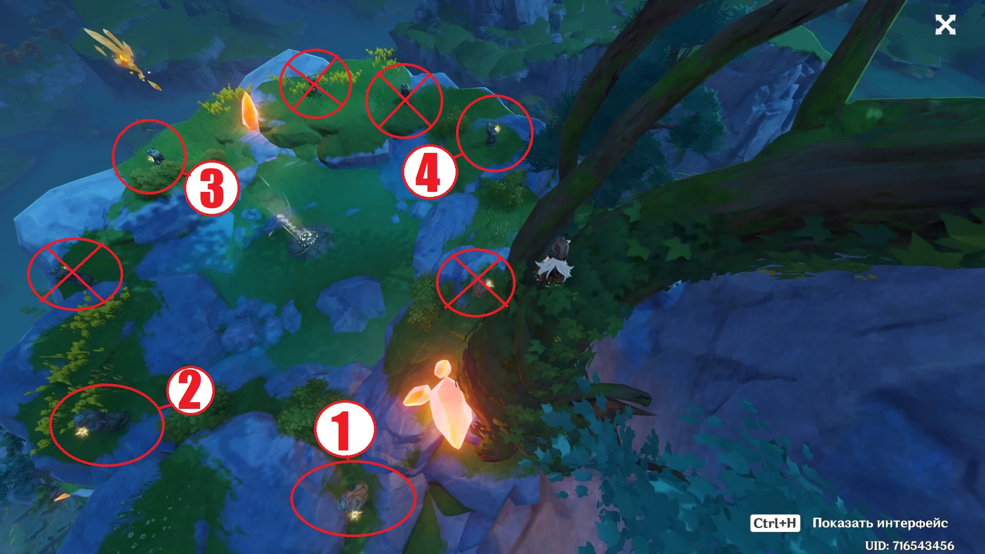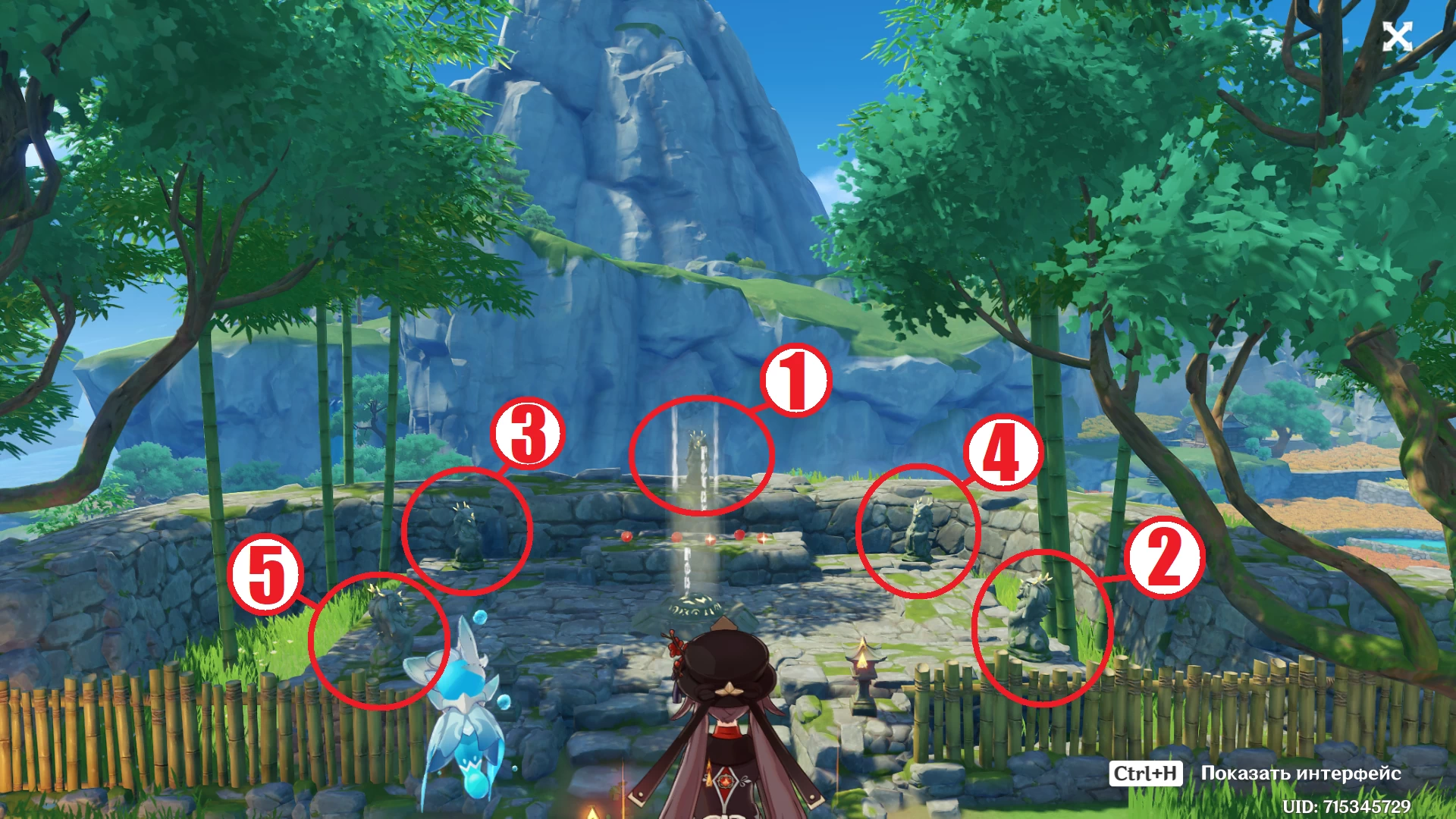 Здесь придется забраться на высокую гору рядом с деревней. Наверху находятся несколько статуй. Нужно активировать только часть статуй, неправильный порядок или ненужные статуи обнуляют прогресс. Точный порядок на скриншоте: