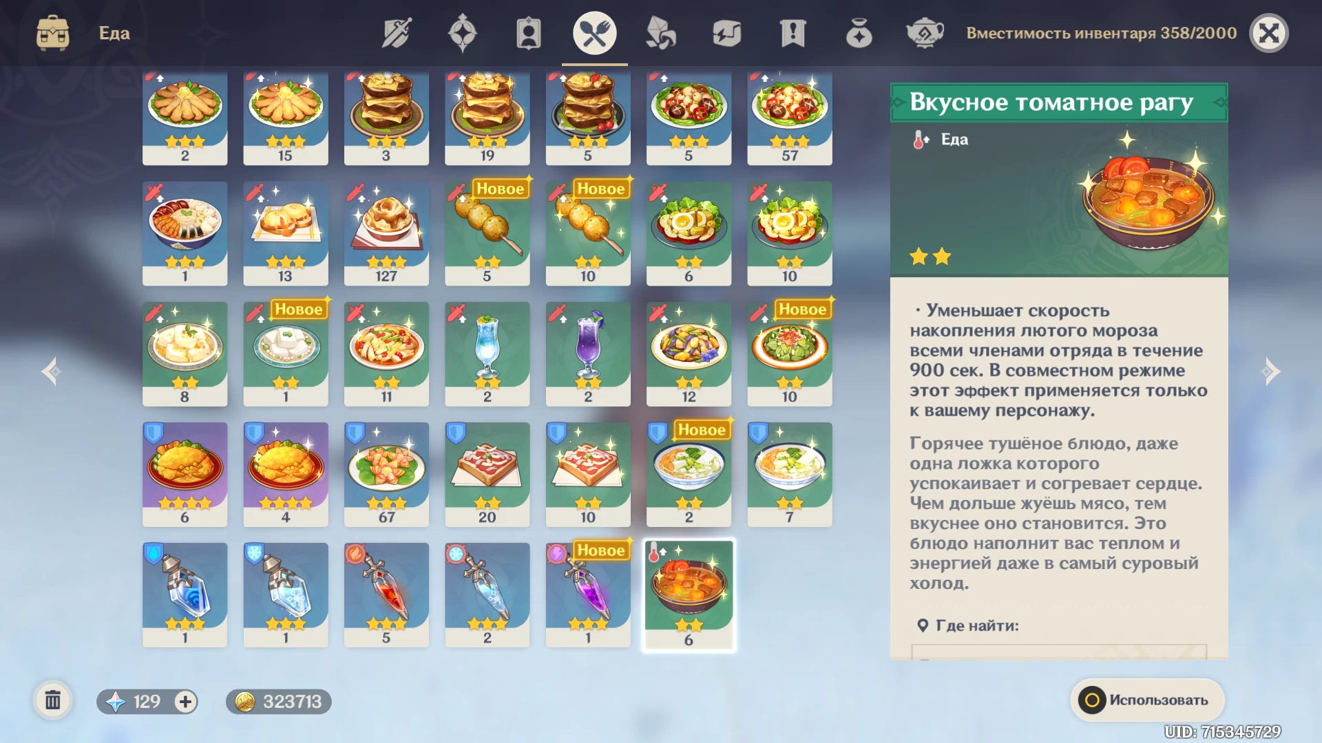 Из еды можете взять Искушение Адепта, увеличивающее силу атаки и вероятность нанесения критического урона, Мондштадтские оладушки, восстанавливающие здоровье, и Вкусное томатное рагу, снижающее скорость накопления лютого мороза.