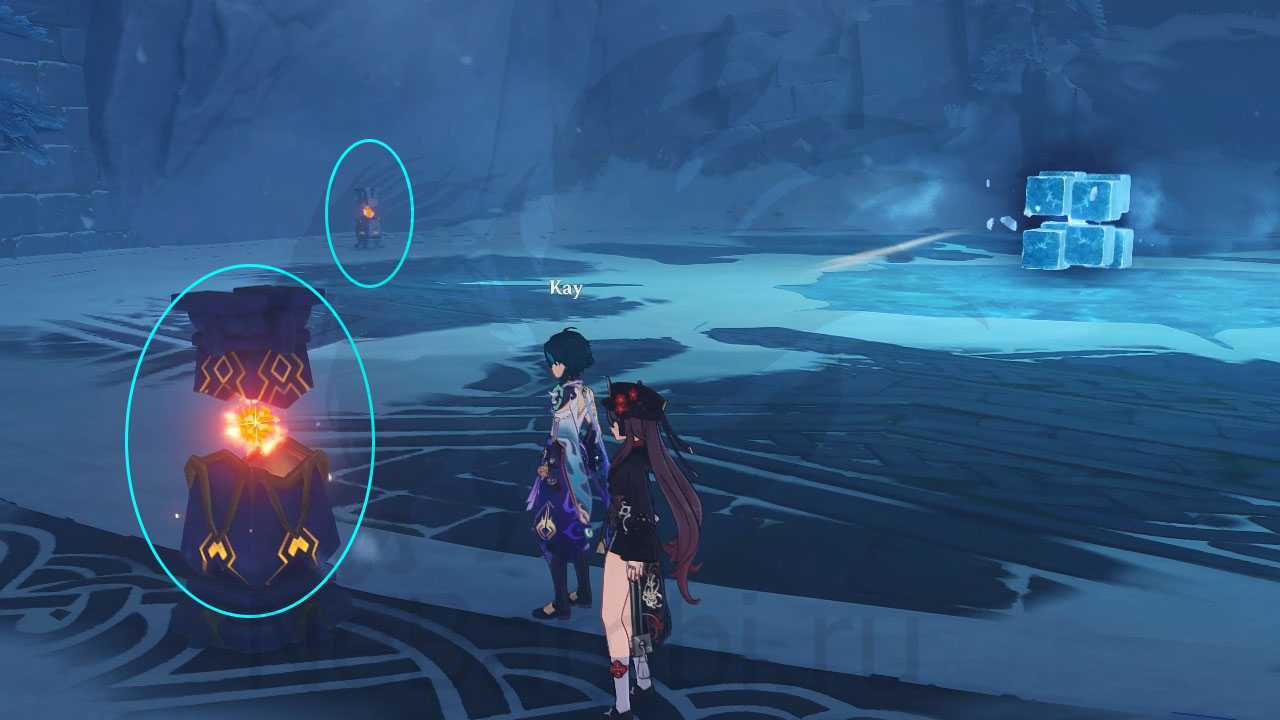 Нажмите на камень и активируйте фею. Следите за тем как она летает, она подскажет вам правильный порядок активации крио колонн. Появится сундук в котором тоже будет Багровый агат. Самое сложное, что после этого вам придётся сразиться с тремя стражами, так что будьте готовы.