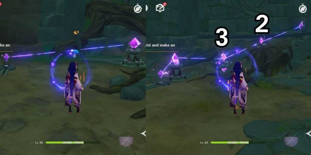Здесь процесс прост. Подойдите к гнездовью и прикоснитесь к ней. Как только вы это сделаете, появятся три фиолетовых пера. Следуйте значку на мини-карте, чтобы собрать их. После этого вернитесь к дереву и сделайте подношение гнездовью. Затем дерево начнет светиться, и туман над этой конкретной частью острова рассеется. Сейчас это может показаться достаточно простым, но по мере продолжения квеста все будет усложняться.